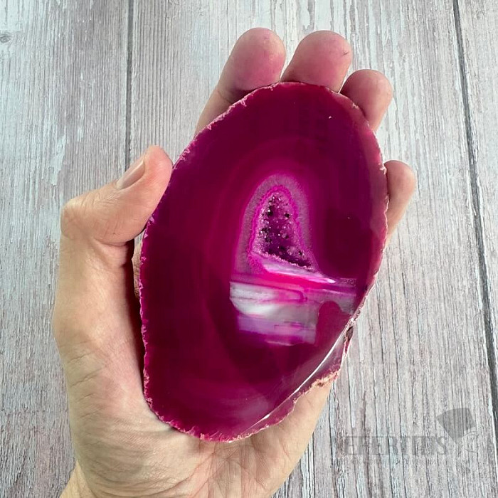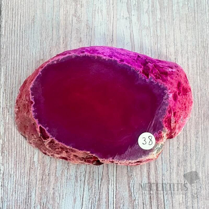 Atraktivní leštěný plátek achátu. Dekorativní prvek, který vzniká rozříznutím a leštěním přírodního achátu. Tento achátový plátek je dobarvovaný. Kupujete přímo vyobrazený kus.