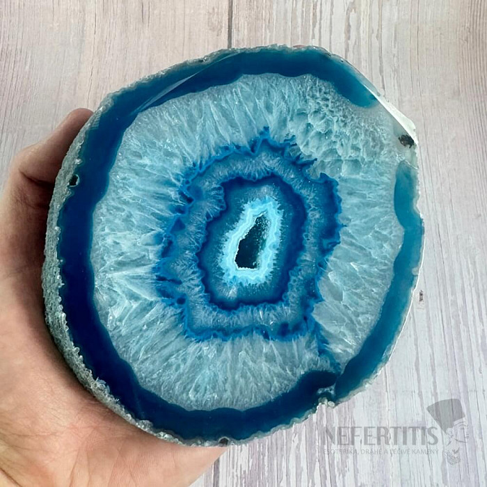 Atraktivní leštěný plátek achátu. Dekorativní prvek, který vzniká rozříznutím a leštěním přírodního achátu. Tento achátový plátek je dobarvovaný. Kupujete přímo vyobrazený kus.