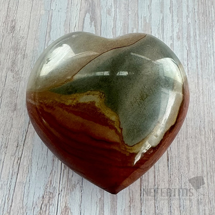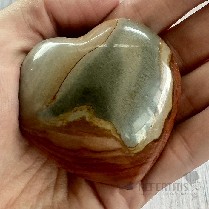 Leštěný polychromní jaspis ve tvaru srdce výběrové kvality.