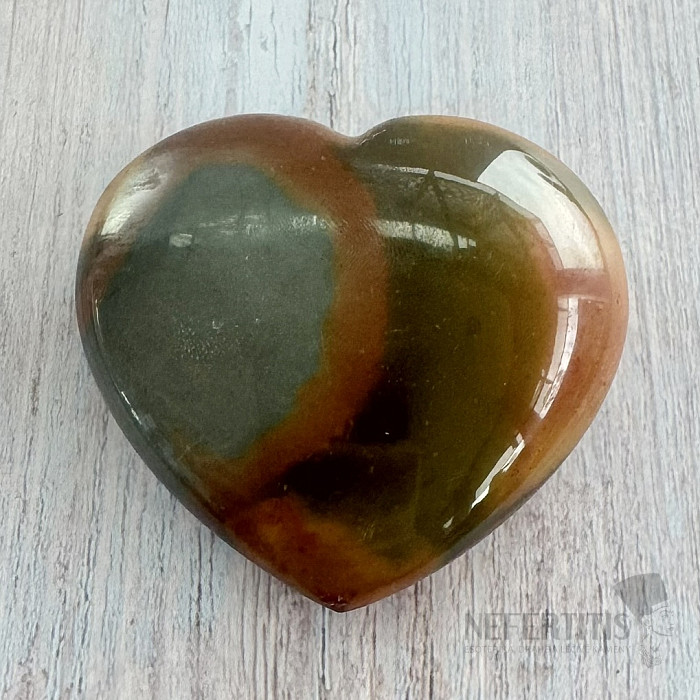 Leštěný polychromní jaspis ve tvaru srdce výběrové kvality.