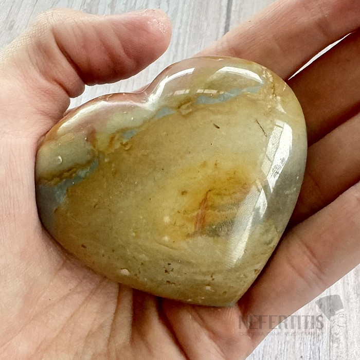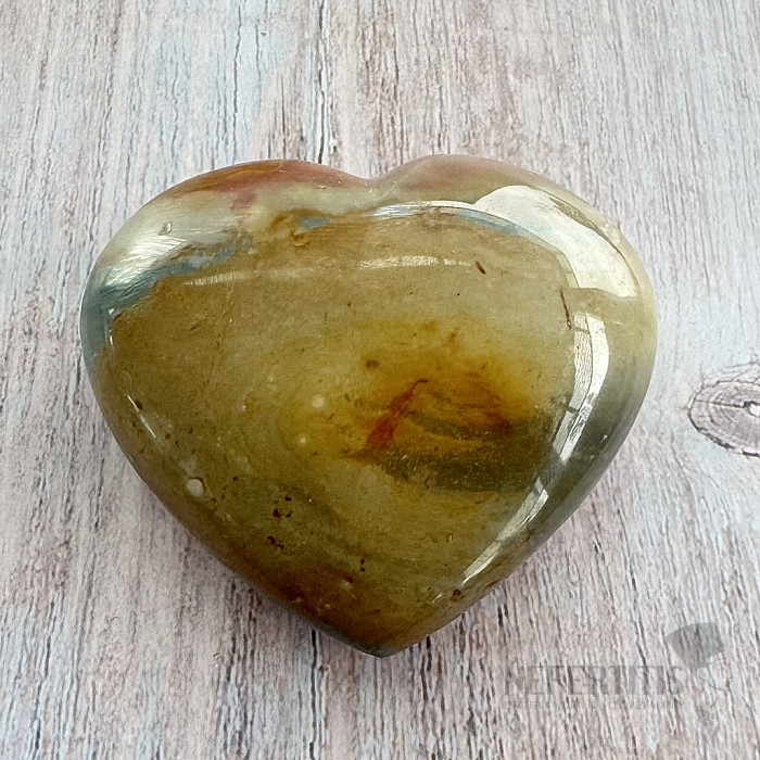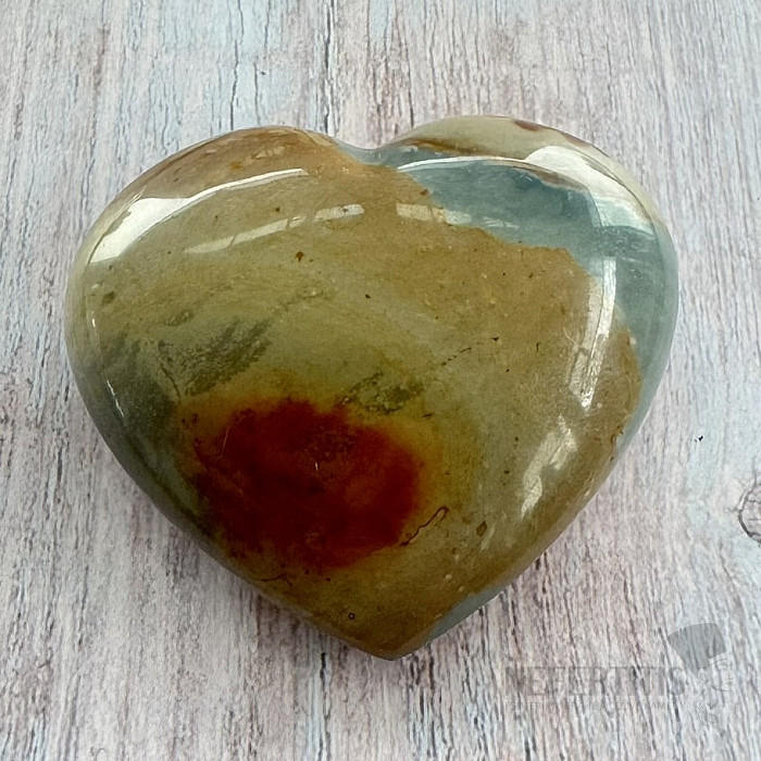 Leštěný polychromní jaspis ve tvaru srdce výběrové kvality.