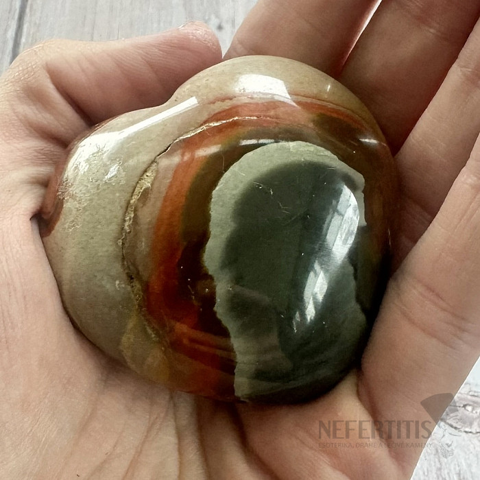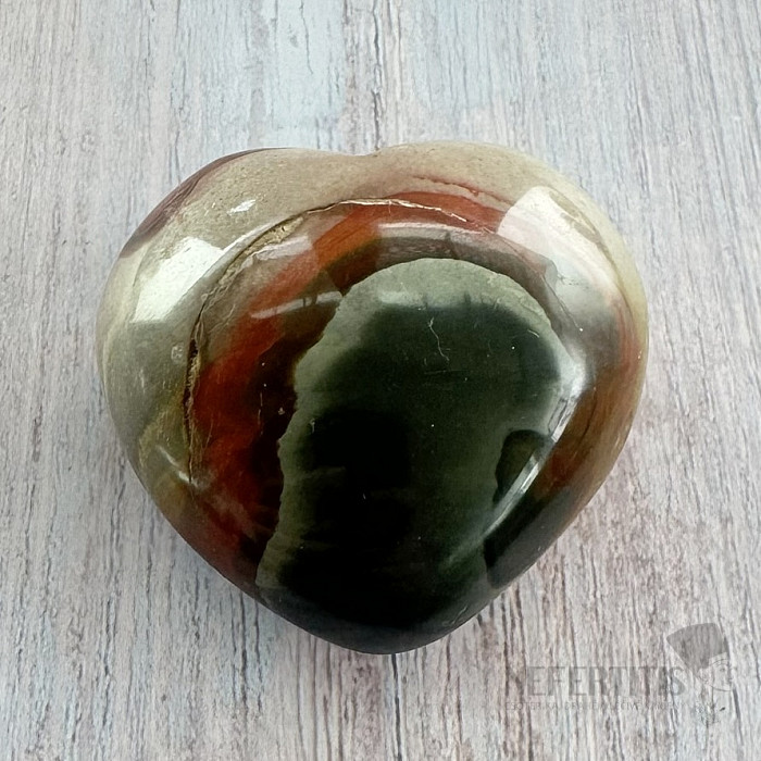 Leštěný polychromní jaspis ve tvaru srdce výběrové kvality.