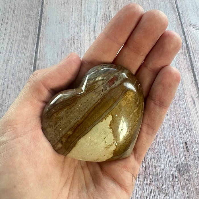 Leštěný polychromní jaspis ve tvaru srdce výběrové kvality.