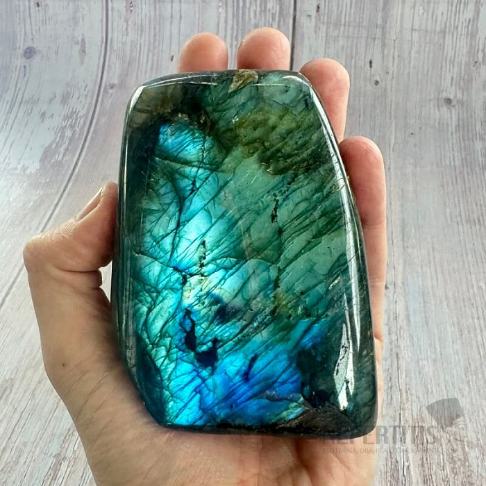 Nádherný, ručně leštěný duhový labradorit volného tvaru s výraznou hrou barev, ve které se při dopadu světla kouzelně rozzáří jasná modrá barva. Dekorativní freeform ve výběrové kvalitě.