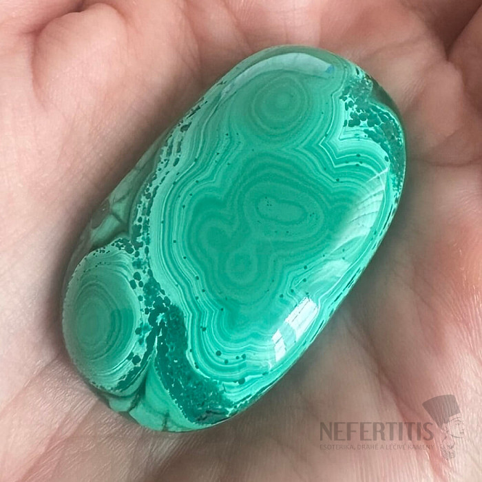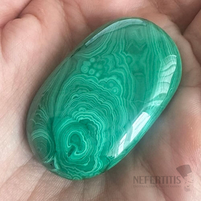 Leštěná, ohlazená hmatka z malachitu s velice hezkou a výraznou kresbou. Kupujete přímo vyobrazenou hmatku.