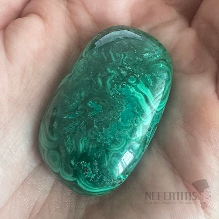 Leštěná, ohlazená hmatka z malachitu s velice hezkou a výraznou kresbou. Kupujete přímo vyobrazenou hmatku.