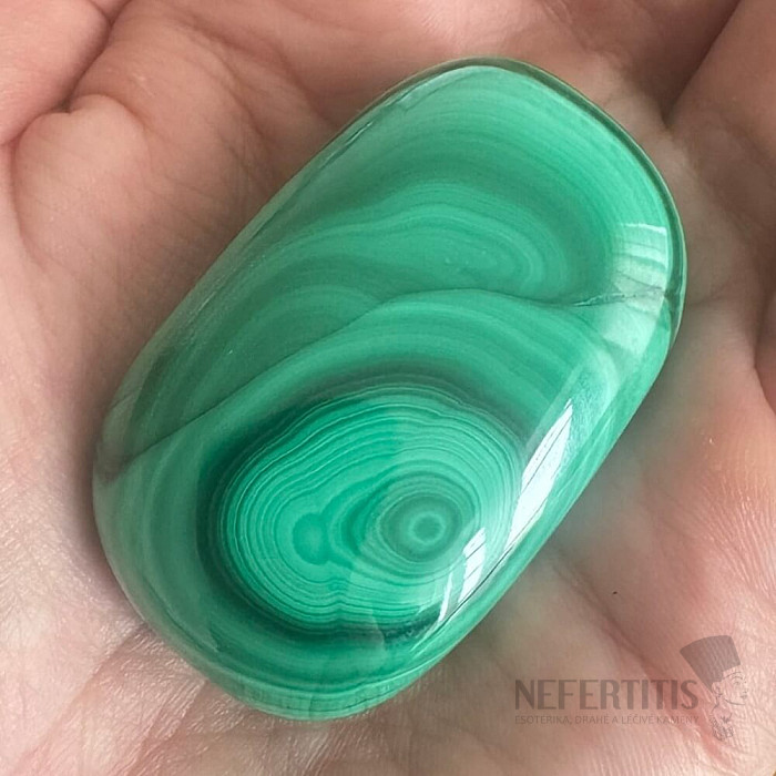 Leštěná, ohlazená hmatka z malachitu s velice hezkou a výraznou kresbou. Kupujete přímo vyobrazenou hmatku.