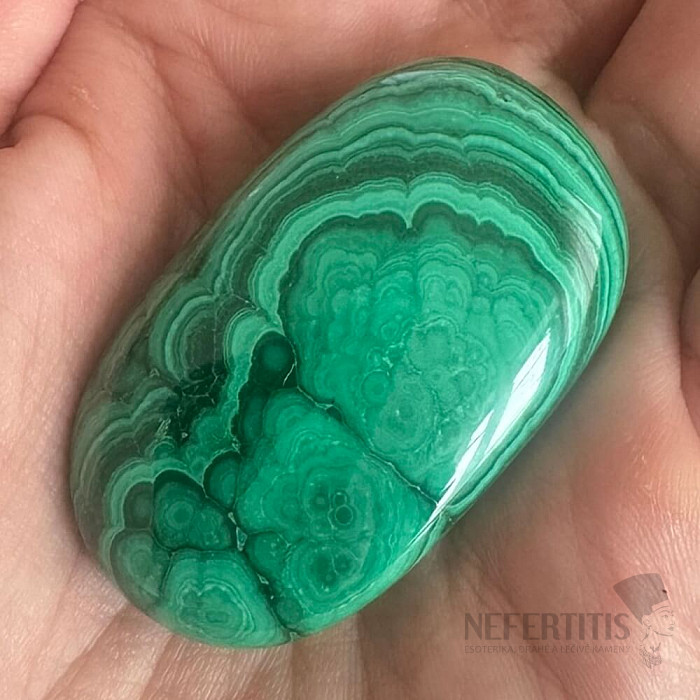 Leštěná, ohlazená hmatka z malachitu s velice hezkou a výraznou kresbou. Kupujete přímo vyobrazenou hmatku.