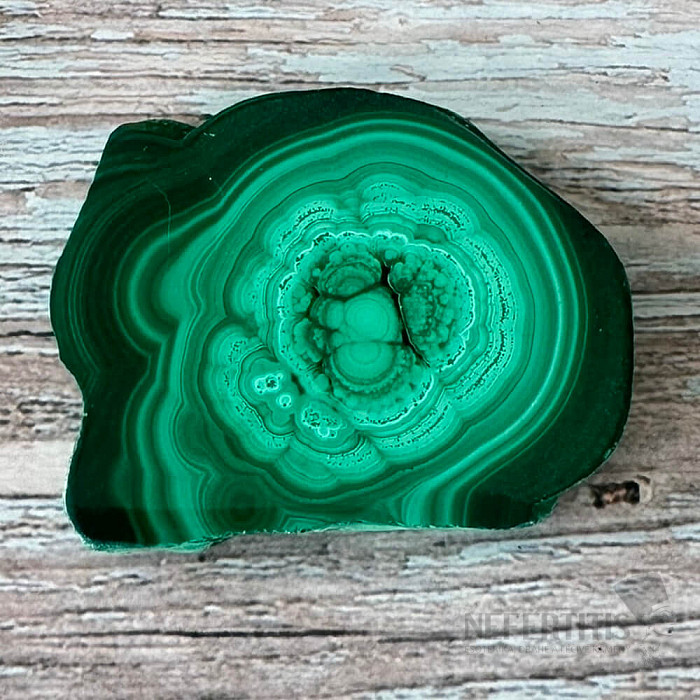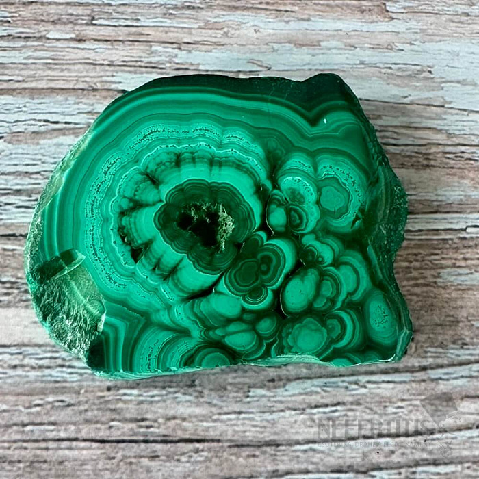 Leštěný, ohlazený plátek malachitu s velice hezkou a výraznou kresbou, ohlazený z obou stran s jemným leskem. Kupujete přímo vyobrazený kus malachitu.