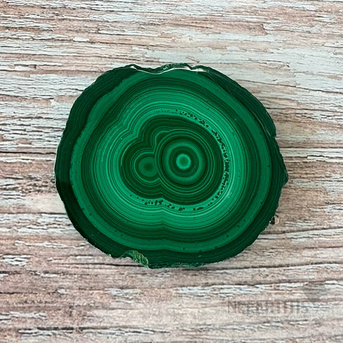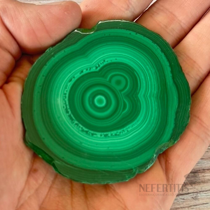 Leštěný, ohlazený plátek malachitu s velice hezkou a výraznou kresbou, ohlazený z obou stran s jemným leskem. Kupujete přímo vyobrazený kus malachitu.