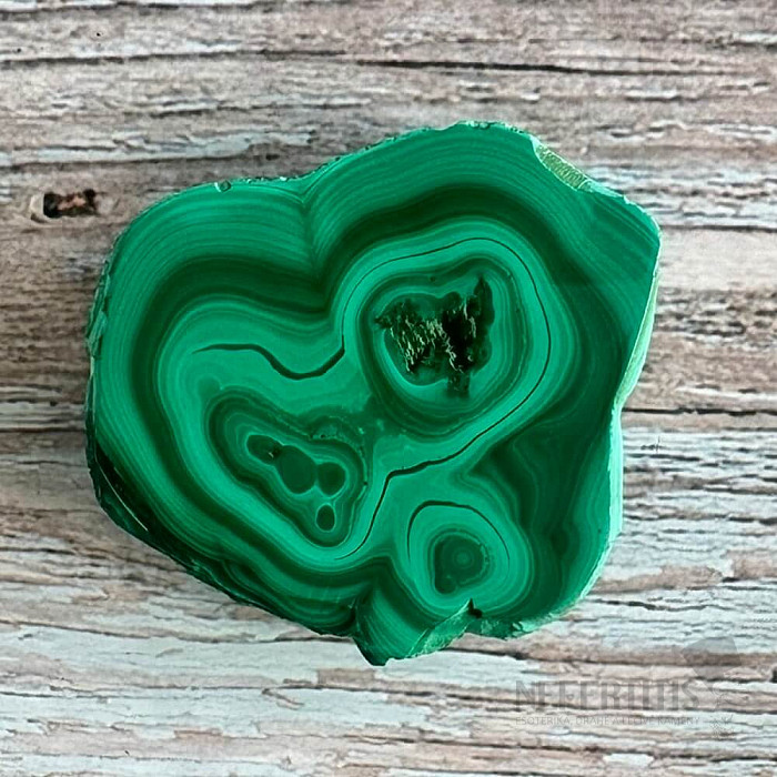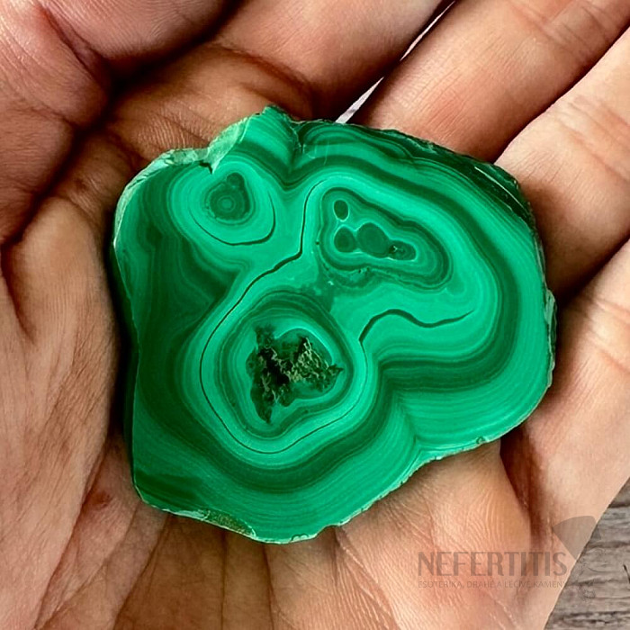 Leštěný, ohlazený plátek malachitu s velice hezkou a výraznou kresbou, ohlazený z obou stran s jemným leskem. Kupujete přímo vyobrazený kus malachitu.
