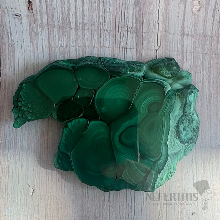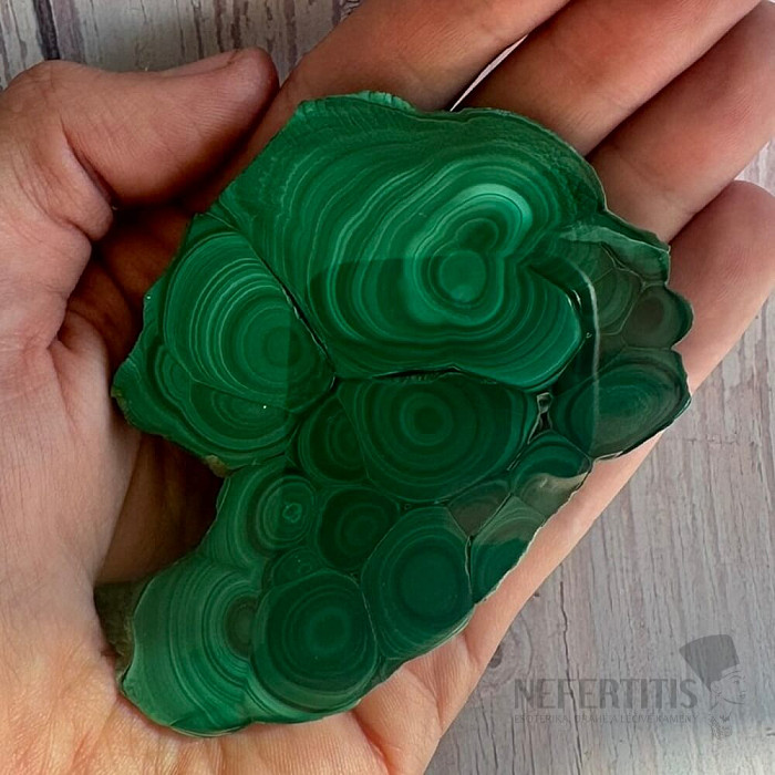Leštěný, ohlazený plátek malachitu s velice hezkou a výraznou kresbou, ohlazený z obou stran s jemným leskem. Kupujete přímo vyobrazený kus malachitu.