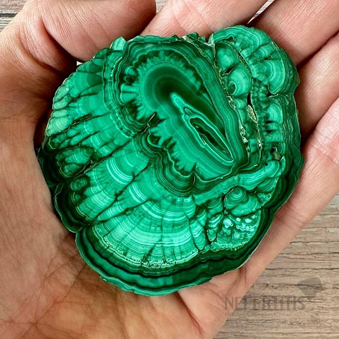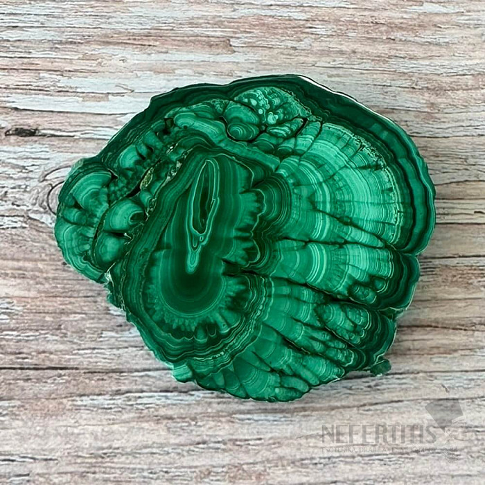 Leštěný, ohlazený plátek malachitu s velice hezkou a výraznou kresbou, ohlazený z obou stran s jemným leskem. Kupujete přímo vyobrazený kus malachitu.