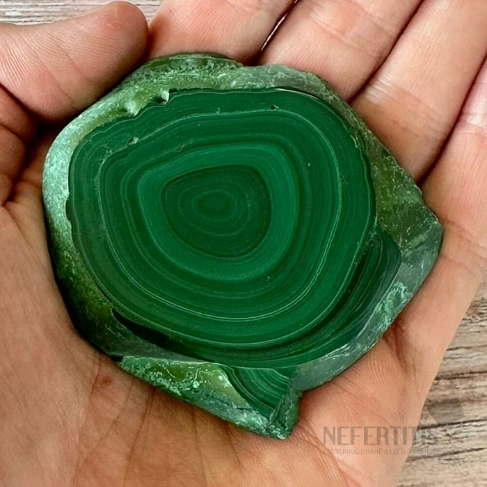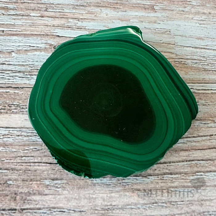 Leštěný, ohlazený plátek malachitu s velice hezkou a výraznou kresbou, ohlazený z obou stran s jemným leskem. Kupujete přímo vyobrazený kus malachitu.