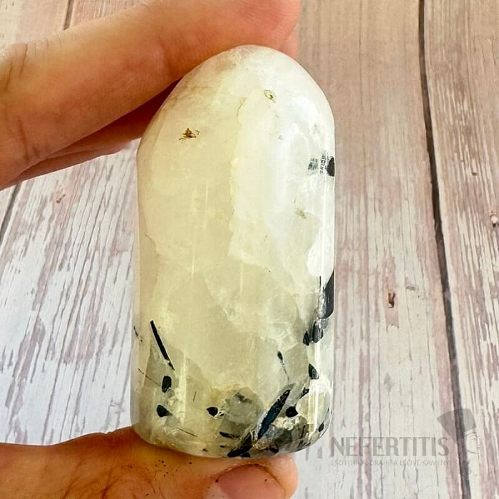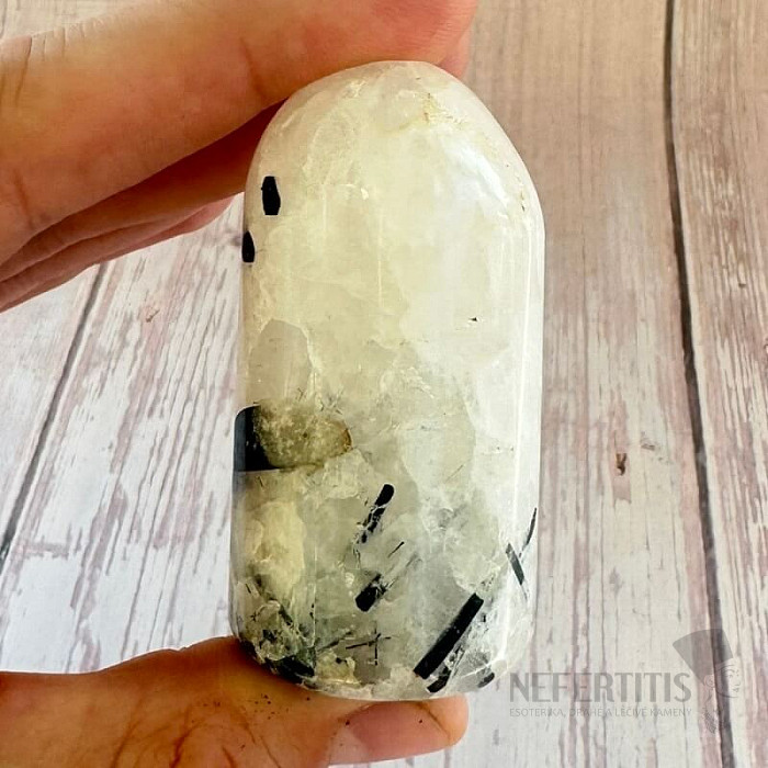 Sbírkový ručně leštěný volný tvar z turmalínu v křišťálu s překrásnou kresbou. Kupujete přímo vyobrazený kus. Křišťál s turmalínem spojuje v jednom krystalu vlastnosti křišťálu i turmalínu. Křišťál s turmalínem dle… více »