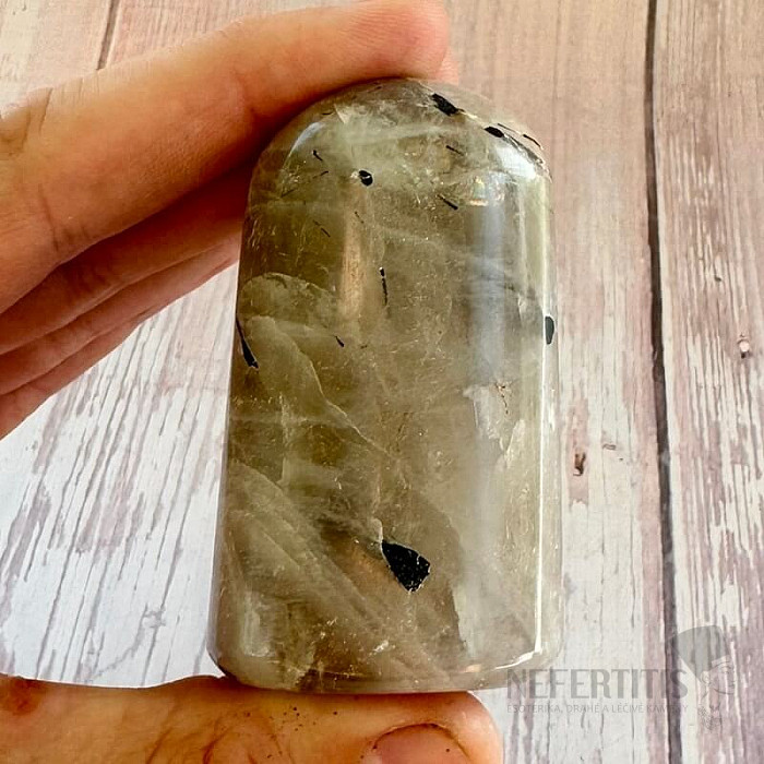 Sbírkový ručně leštěný volný tvar z turmalínu v křišťálu s překrásnou kresbou. Kupujete přímo vyobrazený kus. Křišťál s turmalínem spojuje v jednom krystalu vlastnosti křišťálu i turmalínu. Křišťál s turmalínem dle… více »