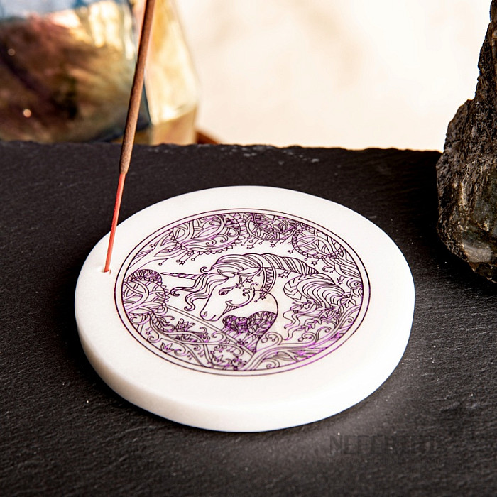 Vneste do svého prostoru kouzlo, čistotu a harmonii s tímto mramorovým stojánkem na vonné tyčinky s vyrytým jednorožcem.
