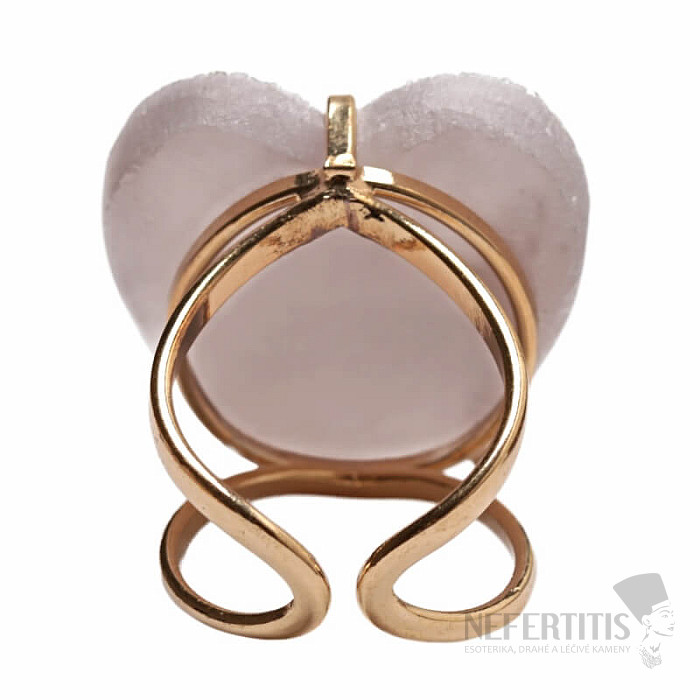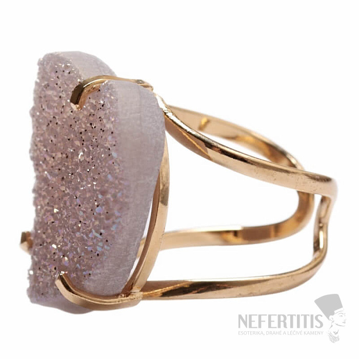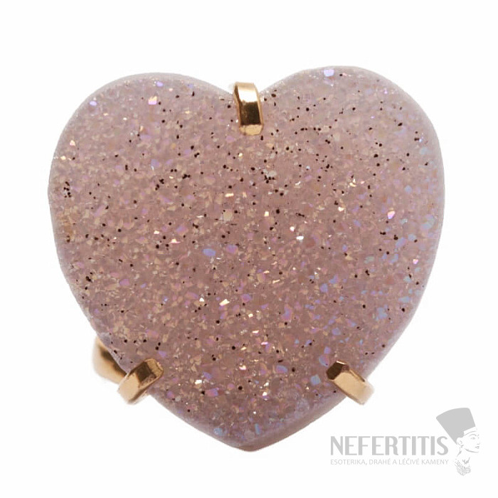 Objevte kouzlo elegance s tímto pozlaceným prstenem, jehož dominantou je drúza z achátu ve tvaru srdce s aqua aura efektem, který vznikne nanesením tenké vrstvy kovu. Drúza se tak krásně třpytí. Každý kámen je originál. Achát je kamenem ochrany, síly a harmonie a skvěle podtrhne vaši osobnost. Materiál: přírodní kámen, pozlacená mosaz. Kupujete přímo vyobrazený prsten.