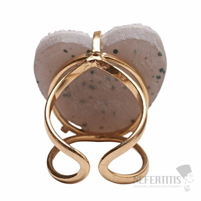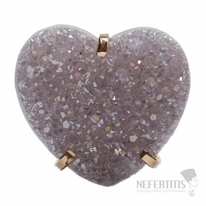 Objevte kouzlo elegance s tímto pozlaceným prstenem, jehož dominantou je drúza z achátu ve tvaru srdce s aqua aura efektem, který vznikne nanesením tenké vrstvy kovu. Drúza se tak krásně třpytí. Každý kámen je originál. Achát je kamenem ochrany, síly a harmonie a skvěle podtrhne vaši osobnost. Materiál: přírodní kámen, pozlacená mosaz. Kupujete přímo vyobrazený prsten.