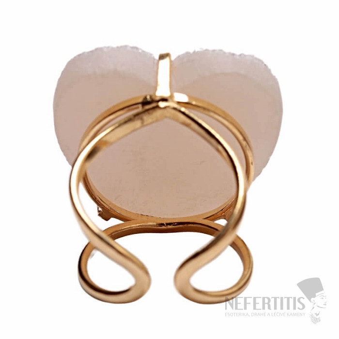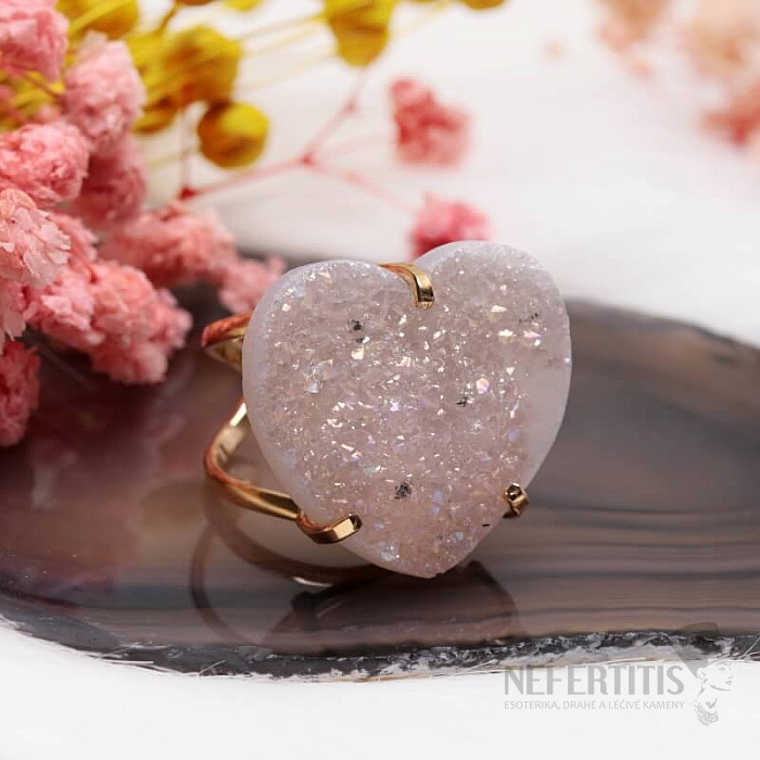 Objevte kouzlo elegance s tímto pozlaceným prstenem, jehož dominantou je drúza z achátu ve tvaru srdce s aqua aura efektem, který vznikne nanesením tenké vrstvy kovu. Drúza se tak krásně třpytí. Každý kámen je originál. Achát je kamenem ochrany, síly a harmonie a skvěle podtrhne vaši osobnost. Materiál: přírodní kámen, pozlacená mosaz. Kupujete přímo vyobrazený prsten.