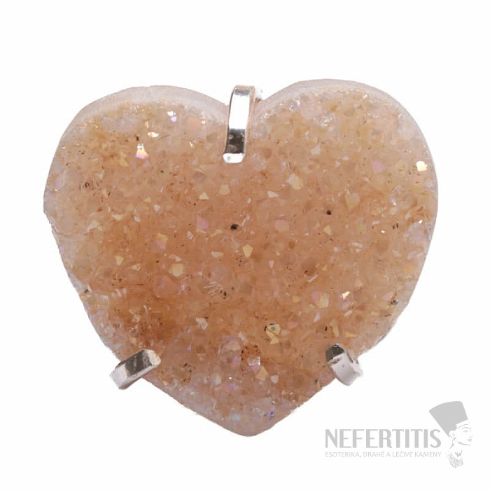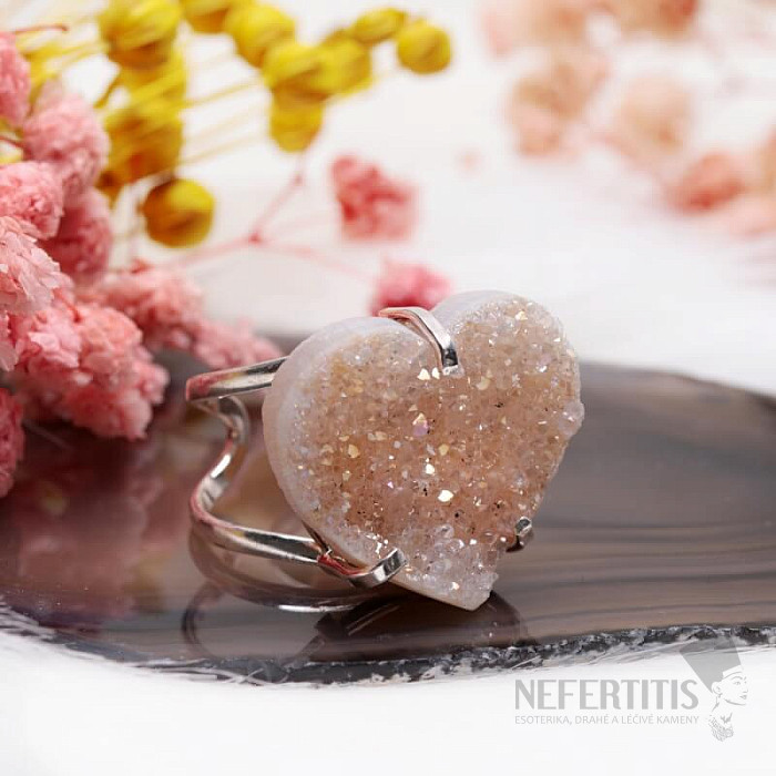 Objevte kouzlo elegance s tímto postříbřeným prstenem, jehož dominantou je drúza z achátu ve tvaru srdce s aqua aura efektem, který vznikne nanesením tenké vrstvy kovu. Drúza se tak krásně třpytí. Každý kámen je originál. Achát je kamenem ochrany, síly a harmonie a skvěle podtrhne vaši osobnost. Materiál: přírodní kámen, postříbřená mosaz. Kupujete přímo vyobrazený prsten.