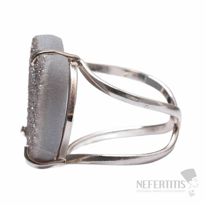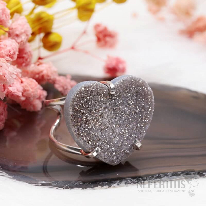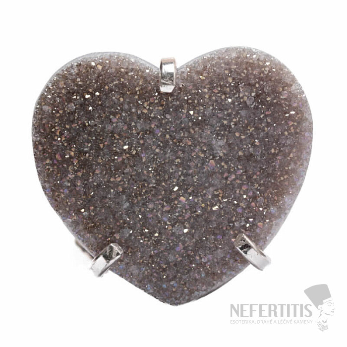 Objevte kouzlo elegance s tímto postříbřeným prstenem, jehož dominantou je drúza z achátu ve tvaru srdce s aqua aura efektem, který vznikne nanesením tenké vrstvy kovu. Drúza se tak krásně třpytí. Každý kámen je originál. Achát je kamenem ochrany, síly a harmonie a skvěle podtrhne vaši osobnost. Materiál: přírodní kámen, postříbřená mosaz. Kupujete přímo vyobrazený prsten.