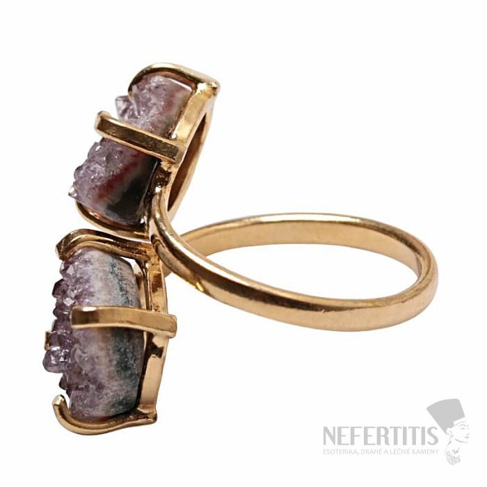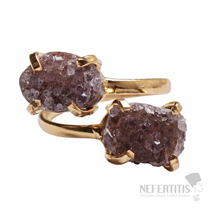 Objevte kouzlo něžné elegance s tímto pozlaceným prstenem, jehož dominantou jsou dvě drúzy ametystu. Každý kámen je originál. Prsten je oslavou ženské krásy a individuality. Ametyst je kamenem vášně, lásky a porozumění. Materiál: přírodní kámen, pozlacená mosaz. Kupujete přímo vyobrazený prsten.