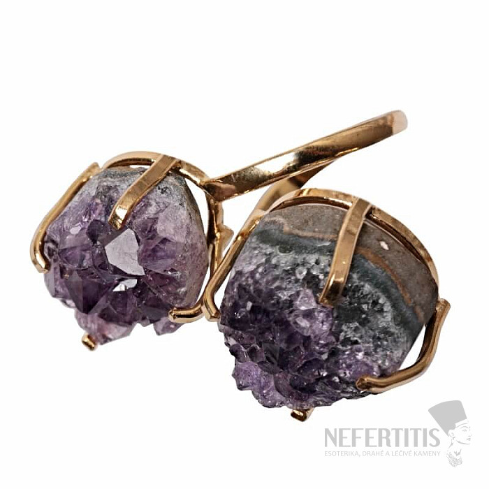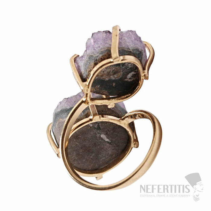 Objevte kouzlo něžné elegance s tímto pozlaceným prstenem, jehož dominantou jsou dvě drúzy ametystu. Každý kámen je originál. Prsten je oslavou ženské krásy a individuality. Ametyst je kamenem vášně, lásky a porozumění. Materiál: přírodní kámen, pozlacená mosaz. Kupujete přímo vyobrazený prsten.