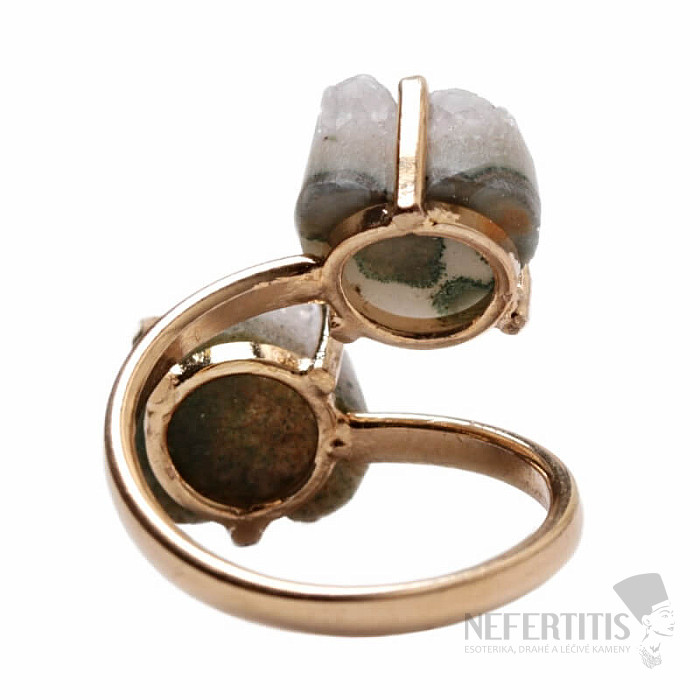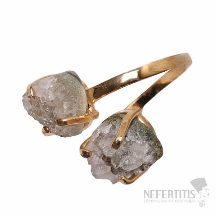Objevte kouzlo něžné elegance s tímto pozlaceným prstenem, jehož dominantou jsou dvě drúzy ametystu. Každý kámen je originál. Prsten je oslavou ženské krásy a individuality. Ametyst je kamenem vášně, lásky a porozumění. Materiál: přírodní kámen, pozlacená mosaz. Kupujete přímo vyobrazený prsten.