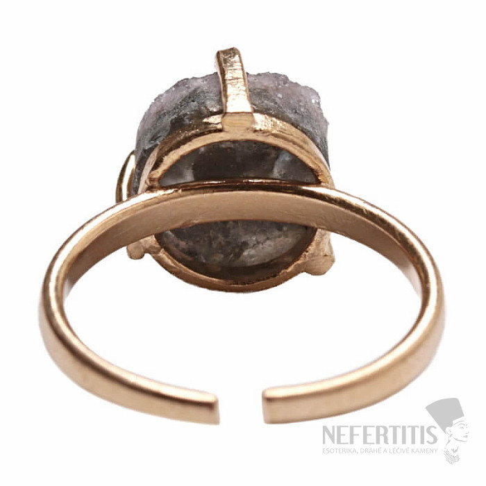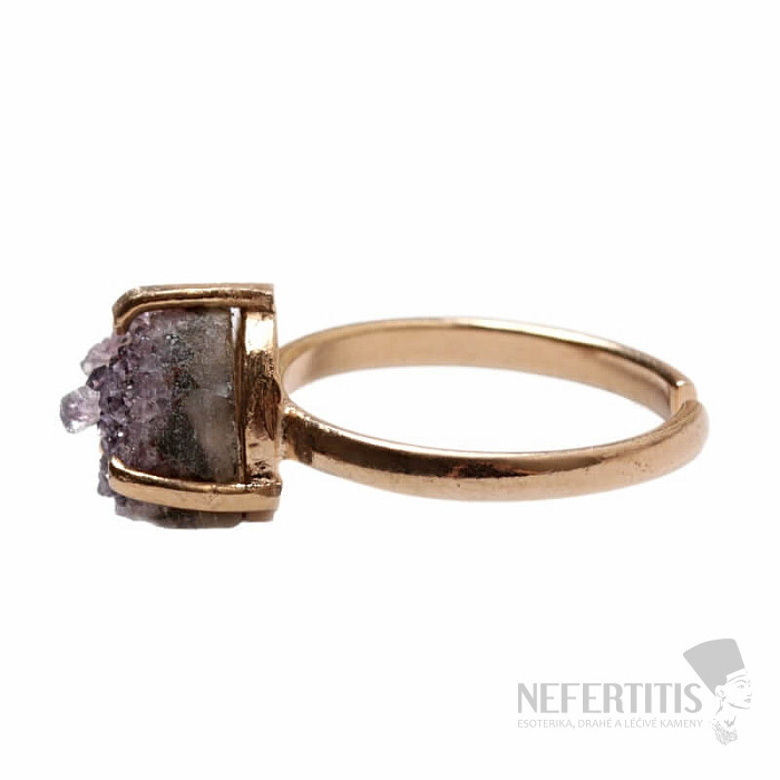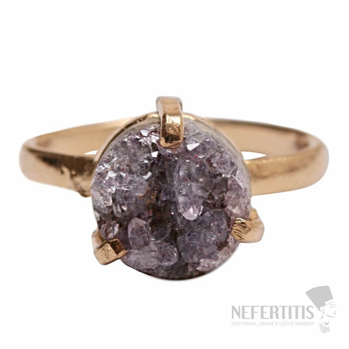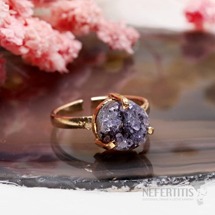 Objevte kouzlo něžné elegance s tímto pozlaceným prstenem, jehož dominantou je drúza ametystu. Každý kámen je originál. Prsten je oslavou ženské krásy a individuality. Ametyst je kamenem vášně, lásky a porozumění. Materiál: přírodní kámen, pozlacená mosaz. Kupujete přímo vyobrazený prsten.