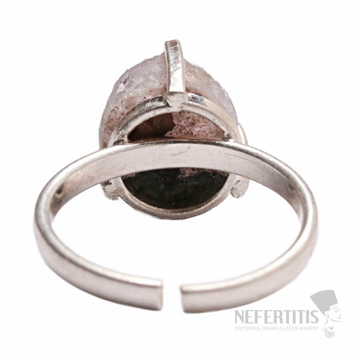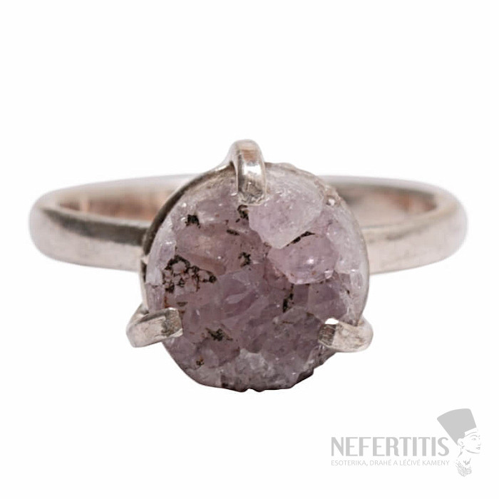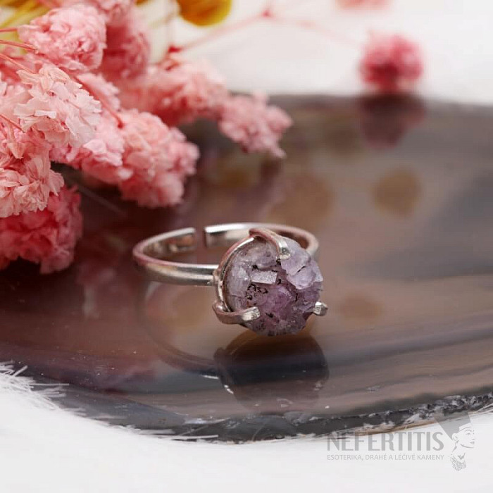 Objevte kouzlo něžné elegance s tímto postříbřeným prstenem, jehož dominantou je drúza ametystu. Každý kámen je originál. Prsten je oslavou ženské krásy a individuality. Ametyst je kamenem vášně, lásky a porozumění. Materiál: přírodní kámen, postříbřená mosaz. Kupujete přímo vyobrazený prsten.