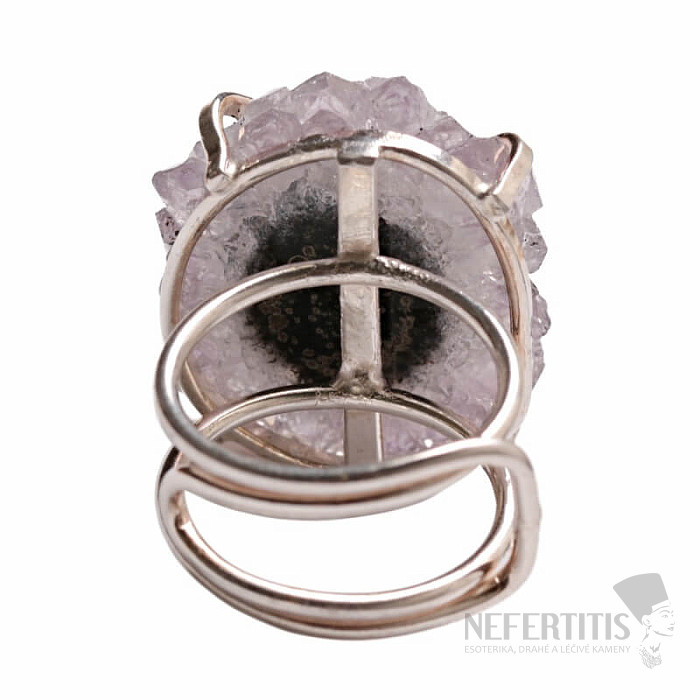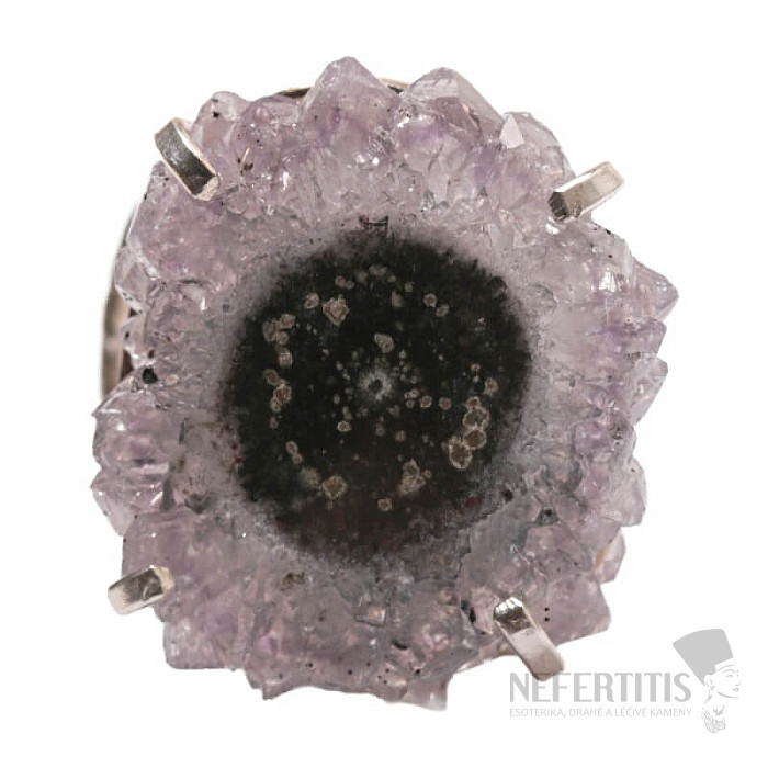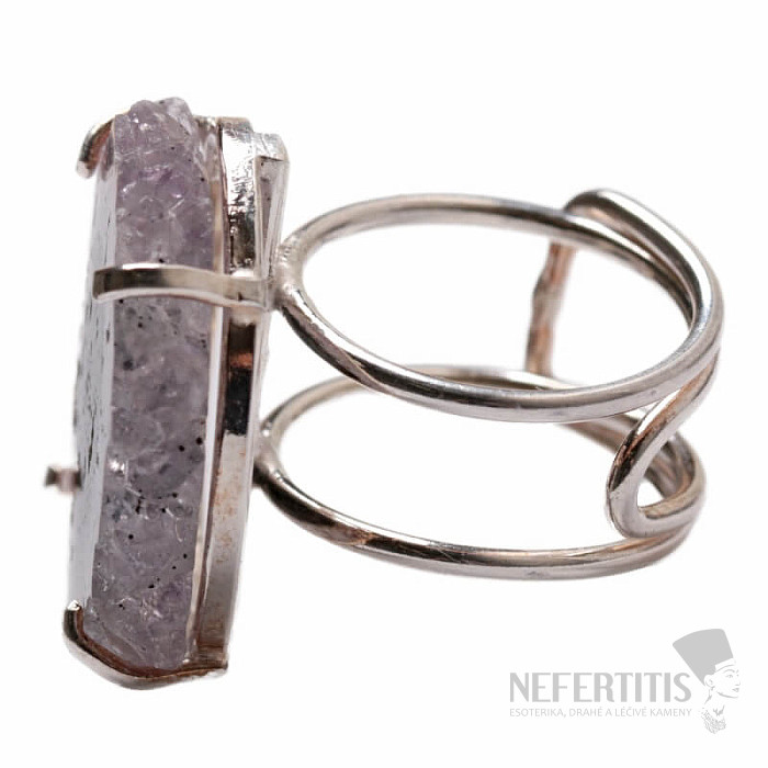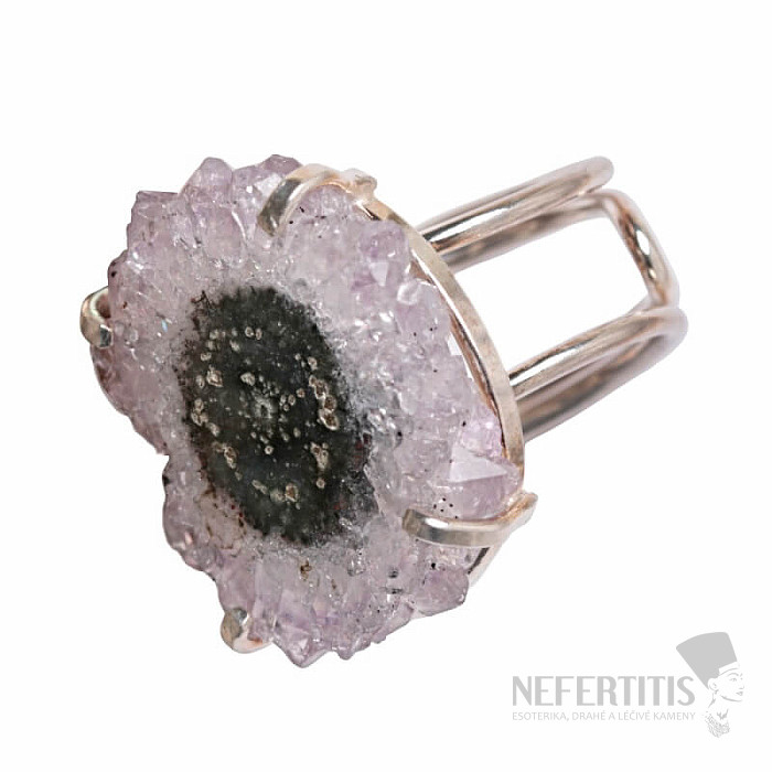 Objevte kouzlo elegance s tímto postříbřeným prstenem, jehož dominantou je řez krápníkem - stalaktitem ametystu. Každý kámen je originál. Ametyst je kamenem lásky, vášně a porozumění. Materiál: přírodní kámen, postříbřená mosaz. Kupujete přímo vyobrazený prsten.