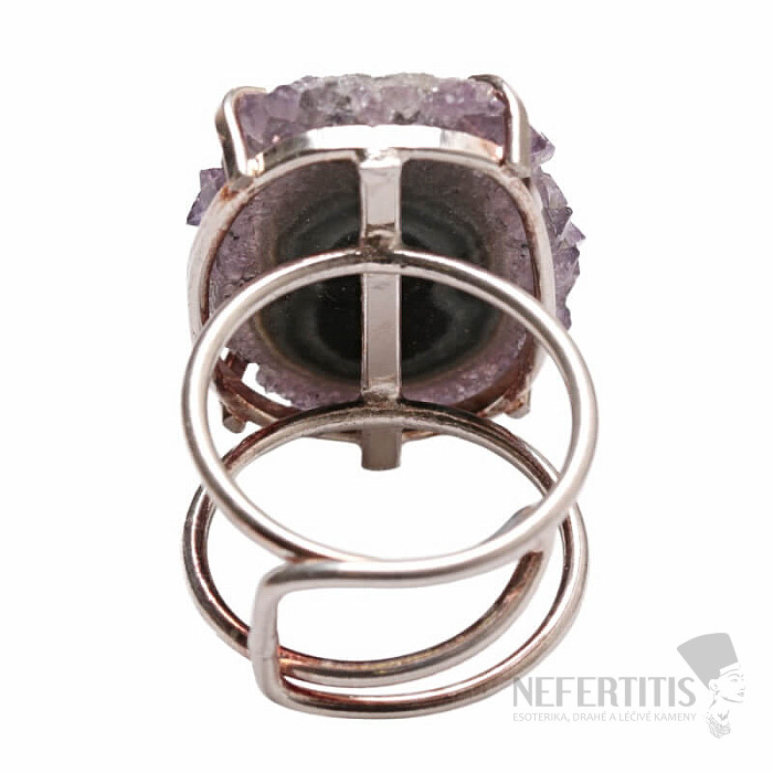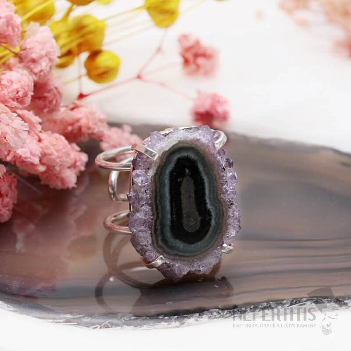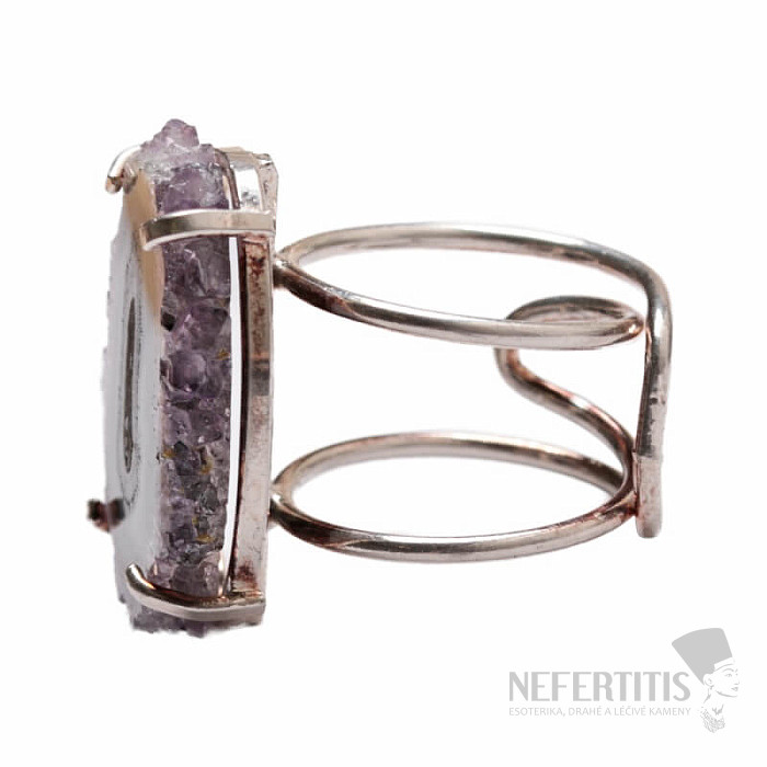Objevte kouzlo elegance s tímto postříbřeným prstenem, jehož dominantou je řez krápníkem - stalaktitem ametystu. Každý kámen je originál. Ametyst je kamenem lásky, vášně a porozumění. Materiál: přírodní kámen, postříbřená mosaz. Kupujete přímo vyobrazený prsten.