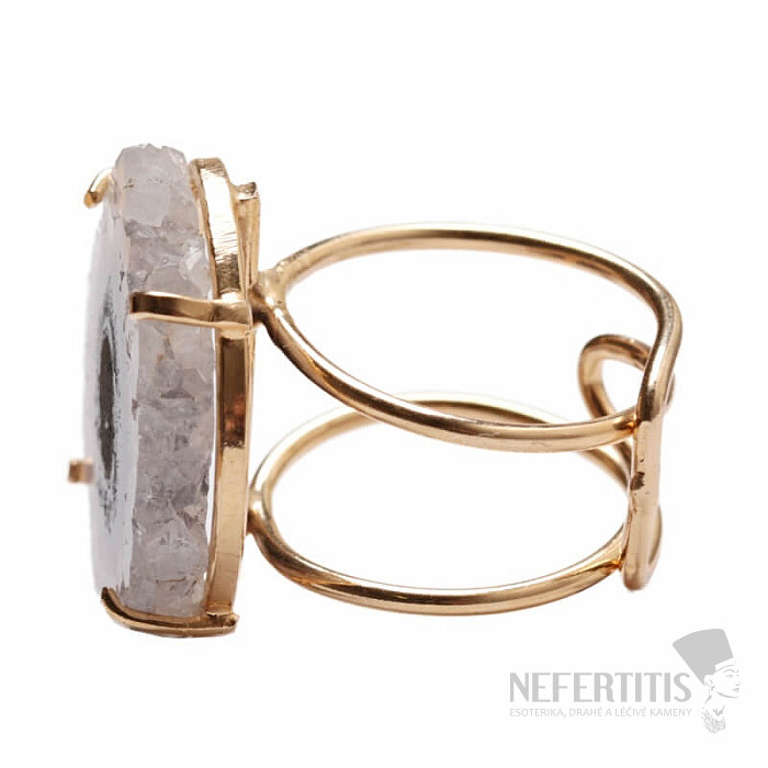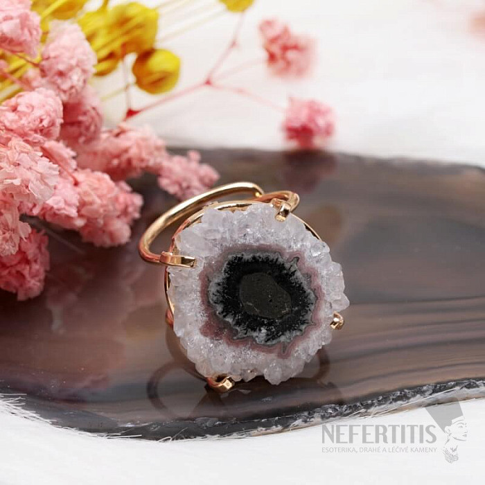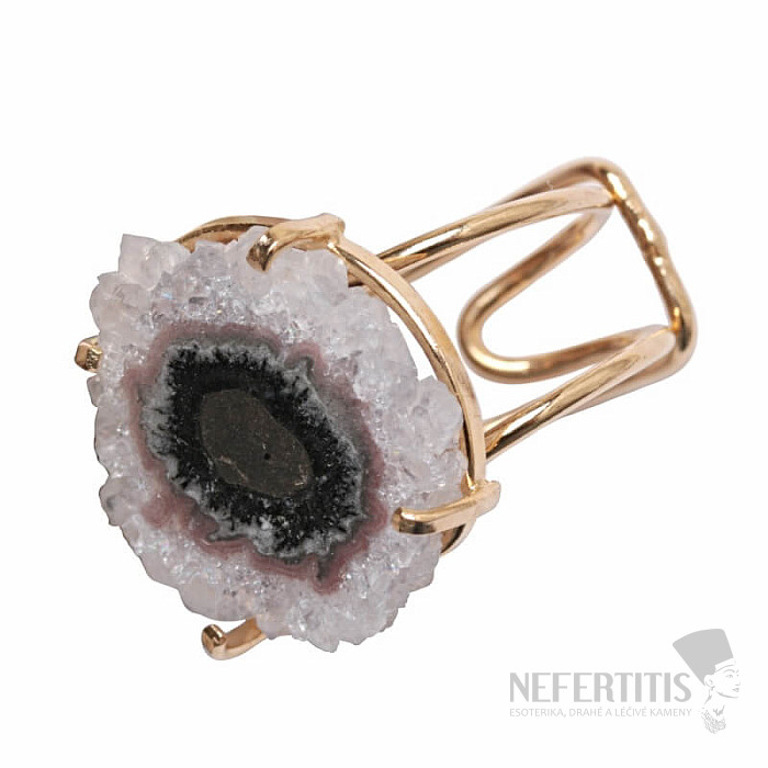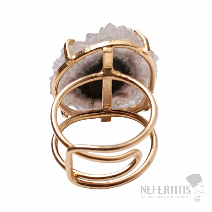 Objevte kouzlo elegance s tímto pozlaceným prstenem, jehož dominantou je řez krápníkem - stalaktitem ametystu. Každý kámen je originál. Ametyst je kamenem lásky, vášně a porozumění. Materiál: přírodní kámen, pozlacená mosaz. Kupujete přímo vyobrazený prsten.
