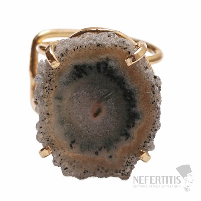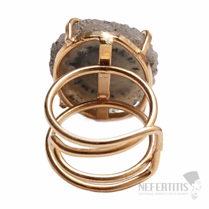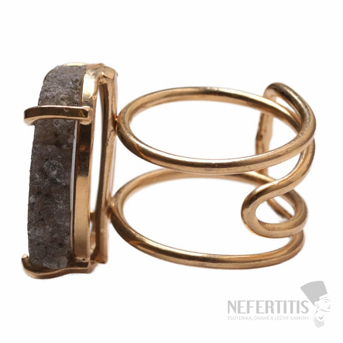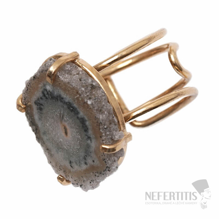 Objevte kouzlo elegance s tímto pozlaceným prstenem, jehož dominantou je řez krápníkem - stalaktitem ametystu. Každý kámen je originál. Ametyst je kamenem lásky, vášně a porozumění. Materiál: přírodní kámen, pozlacená mosaz. Kupujete přímo vyobrazený prsten.
