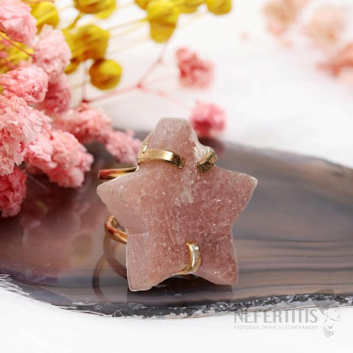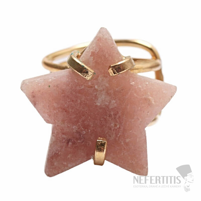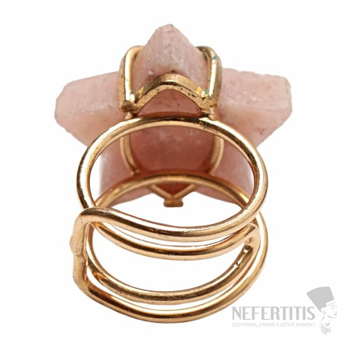 Objevte kouzlo něžné elegance s tímto pozlaceným prstenem, jehož dominantou je hvězda z růžového ametystu. Tento minerál byl objeven poměrně nedávno, a to v Patagonii v Argentině. Jeho těžba je omezená a tím je ještě vzácnější. Každý kámen je originál. Prsten je oslavou ženské krásy a individuality. Ametyst je kamenem vášně, lásky a porozumění. Materiál: přírodní kámen, pozlacená mosaz. Kupujete přímo vyobrazený prsten.