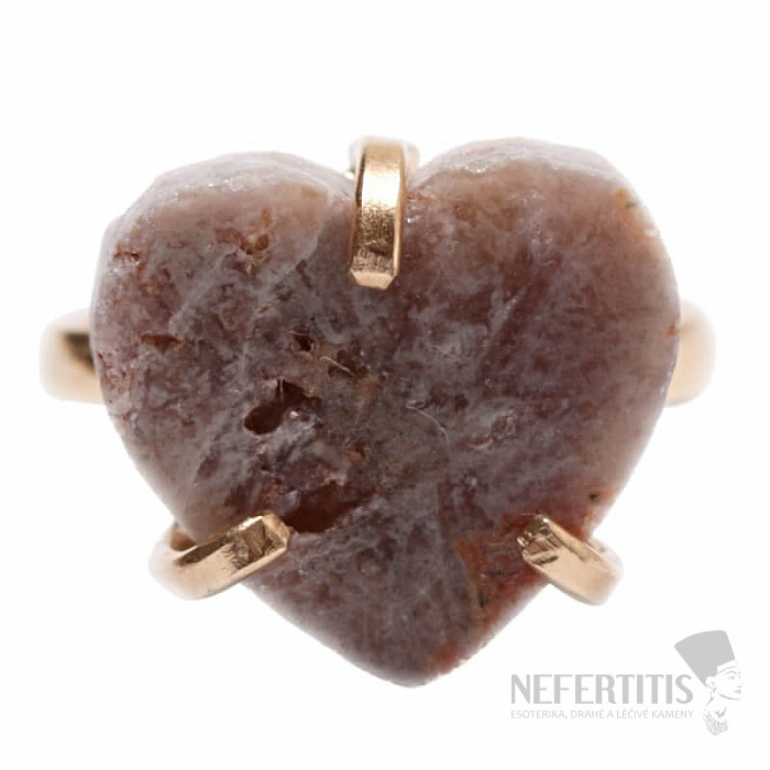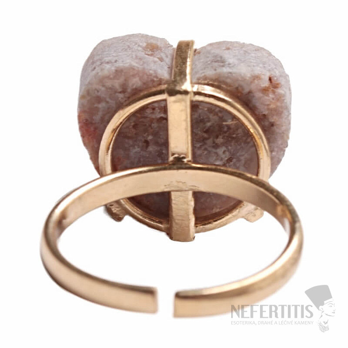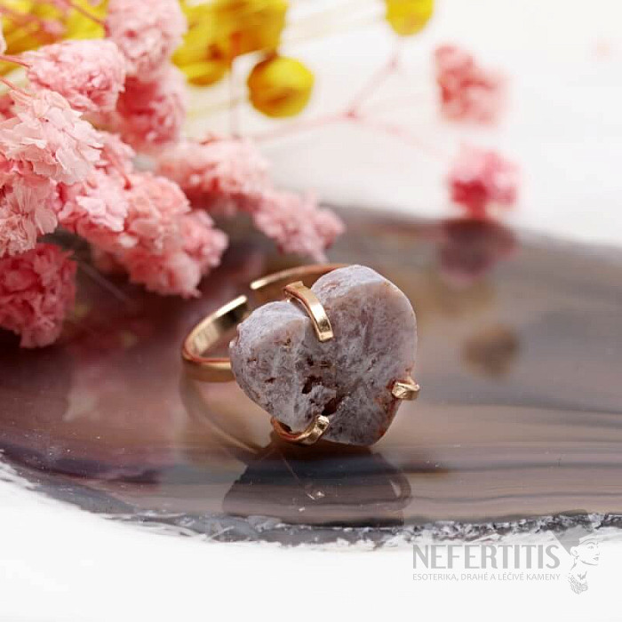 Objevte kouzlo něžné elegance s tímto pozlaceným prstenem, jehož dominantou je srdce z růžového ametystu. Tento minerál byl objeven poměrně nedávno, a to v Patagonii v Argentině. Jeho těžba je omezená a tím je ještě vzácnější. Každý kámen je originál. Prsten je oslavou ženské krásy a individuality. Ametyst je kamenem vášně, lásky a porozumění. Materiál: přírodní kámen, pozlacená mosaz. Kupujete přímo vyobrazený prsten.