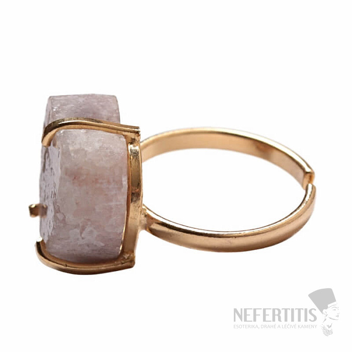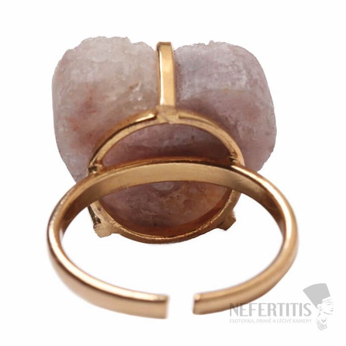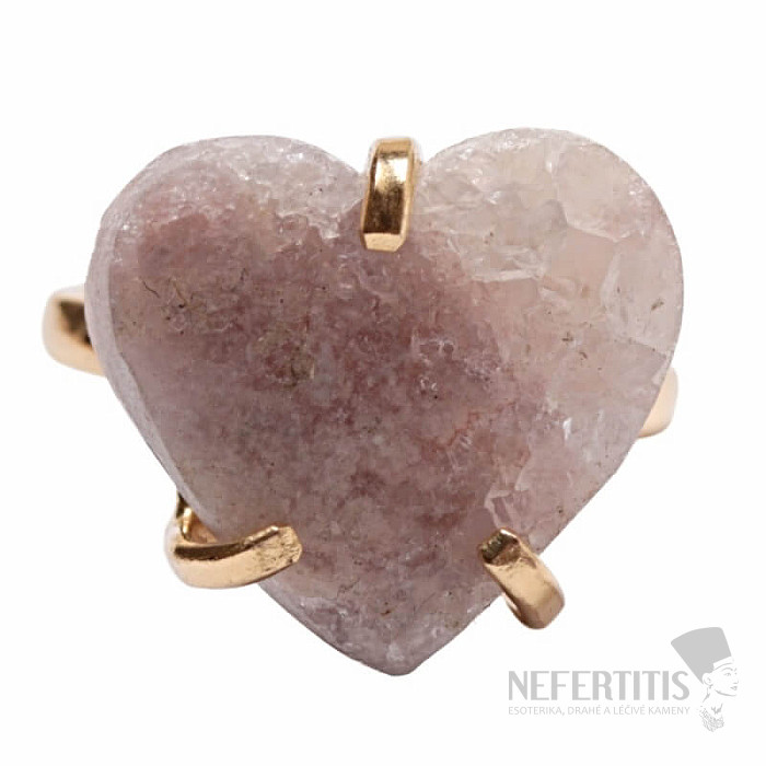 Objevte kouzlo něžné elegance s tímto pozlaceným prstenem, jehož dominantou je srdce z růžového ametystu. Tento minerál byl objeven poměrně nedávno, a to v Patagonii v Argentině. Jeho těžba je omezená a tím je ještě vzácnější. Každý kámen je originál. Prsten je oslavou ženské krásy a individuality. Ametyst je kamenem vášně, lásky a porozumění. Materiál: přírodní kámen, pozlacená mosaz. Kupujete přímo vyobrazený prsten.