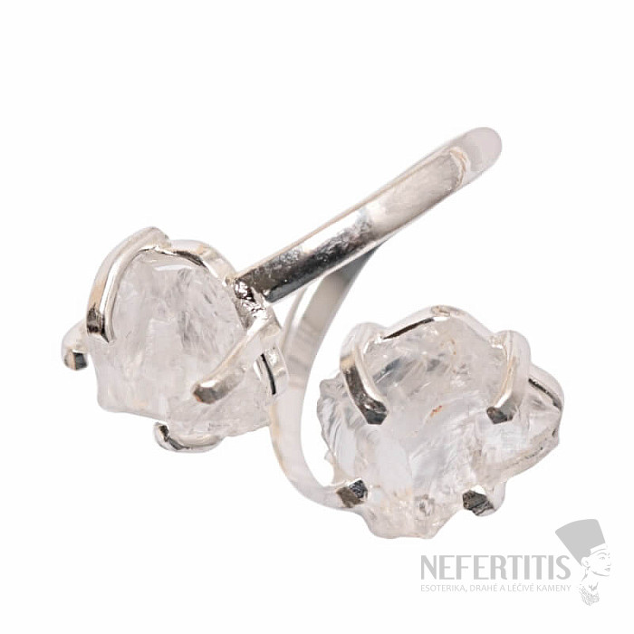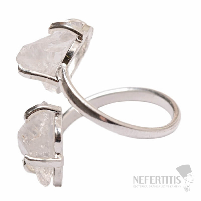 Objevte kouzlo něžné elegance s tímto postříbřeným prstenem, jehož dominantou jsou dva krystaly křišťálu. Každý kámen je originál. Křišťál je považován za univerzální krystal. Jeho nepravidelný tvar a přírodní krása z něj dělají jedinečný šperk s duší. Materiál: přírodní kámen, postříbřená mosaz. Kupujete přímo vyobrazený prsten.