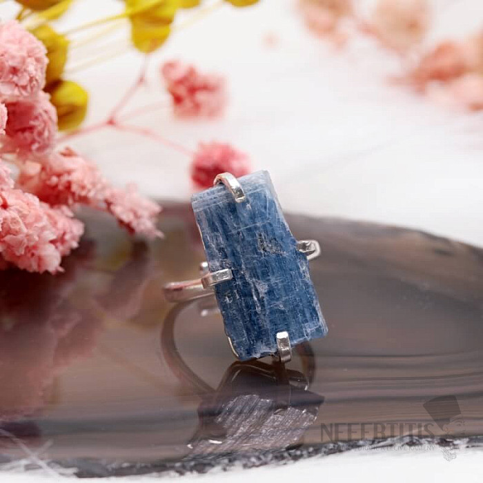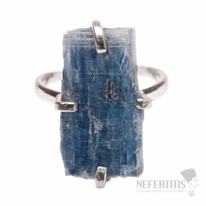 Objevte kouzlo elegance s tímto postříbřeným prstenem, jehož dominantou je surový modrý kyanit. Každý kámen je originál. Kyanit je kámen, který v sobě nese klid hluboké vody, je znám jako kámen vnitřní rovnováhy, komunikace a duševní čistoty. Materiál: přírodní kámen, postříbřená mosaz. Kupujete přímo vyobrazený prsten.