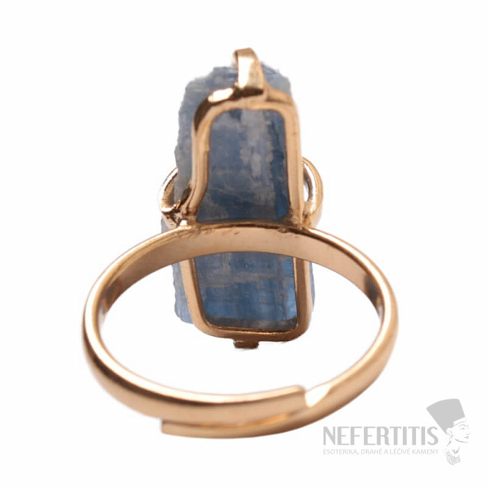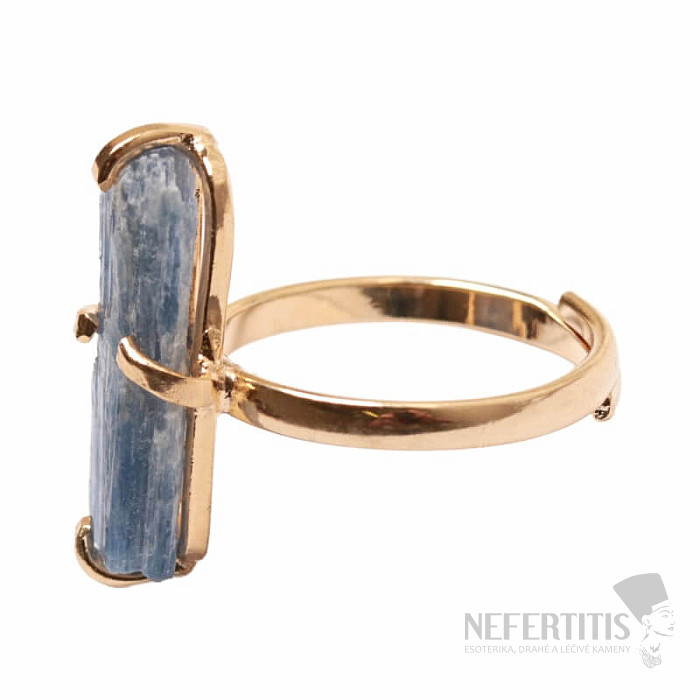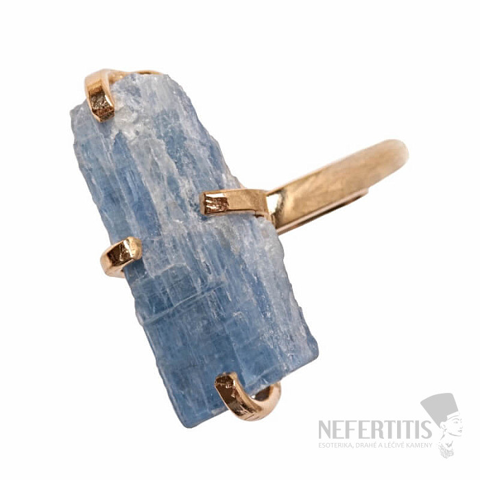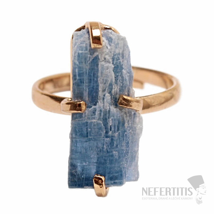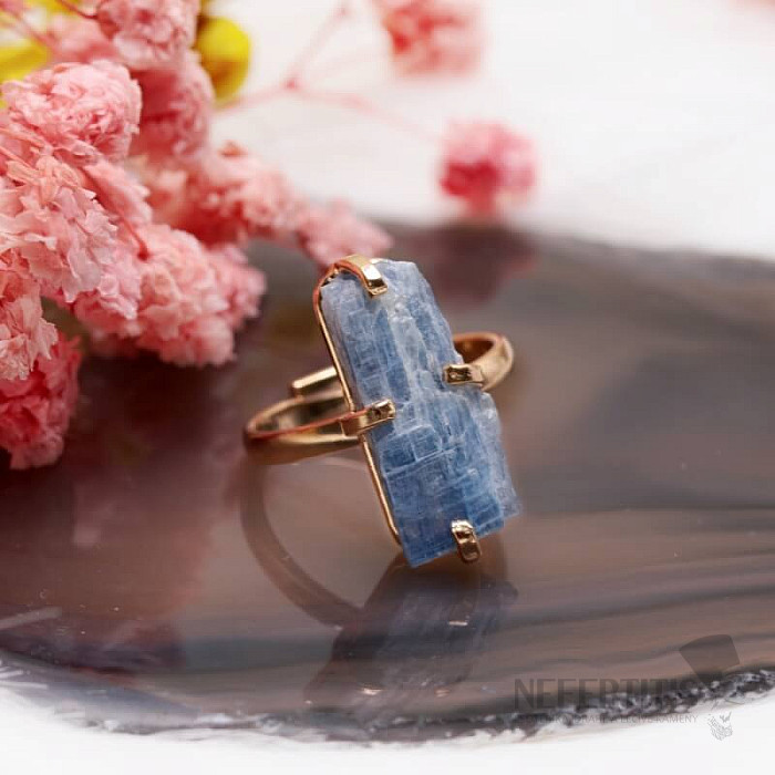 Objevte kouzlo elegance s tímto pozlaceným prstenem, jehož dominantou je surový modrý kyanit. Každý kámen je originál. Kyanit je kámen, který v sobě nese klid hluboké vody, je znám jako kámen vnitřní rovnováhy, komunikace a duševní čistoty. Materiál: přírodní kámen, postříbřená mosaz. Kupujete přímo vyobrazený prsten.