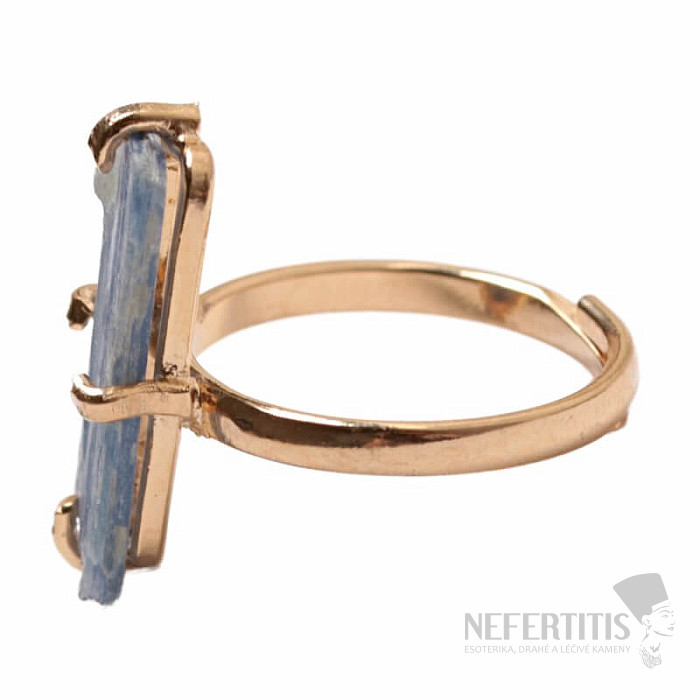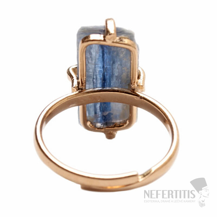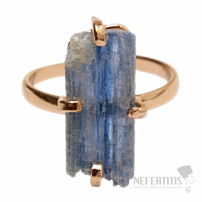 Objevte kouzlo elegance s tímto pozlaceným prstenem, jehož dominantou je surový modrý kyanit. Každý kámen je originál. Kyanit je kámen, který v sobě nese klid hluboké vody, je znám jako kámen vnitřní rovnováhy, komunikace a duševní čistoty. Materiál: přírodní kámen, postříbřená mosaz. Kupujete přímo vyobrazený prsten.