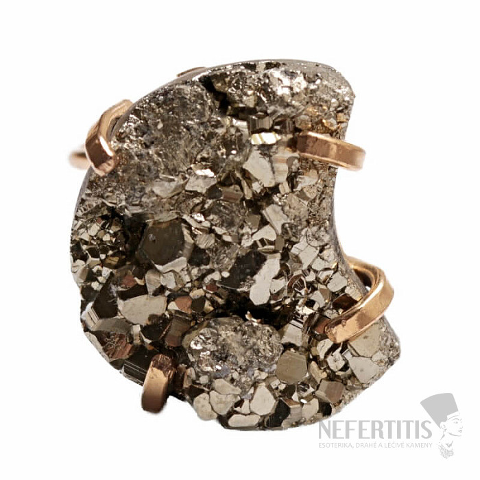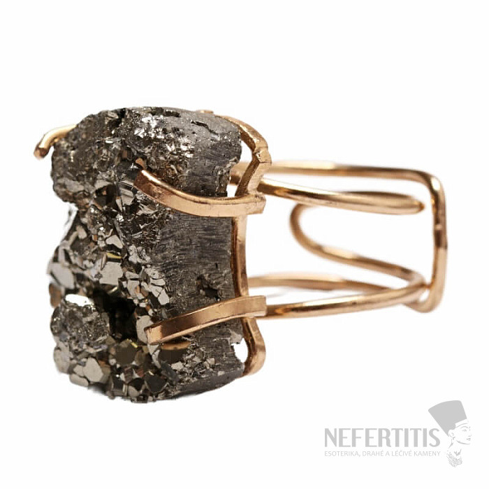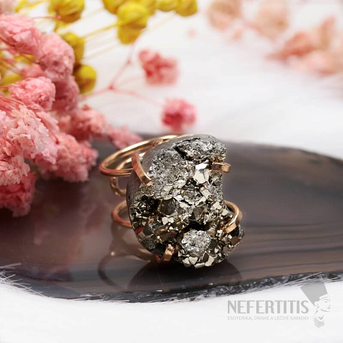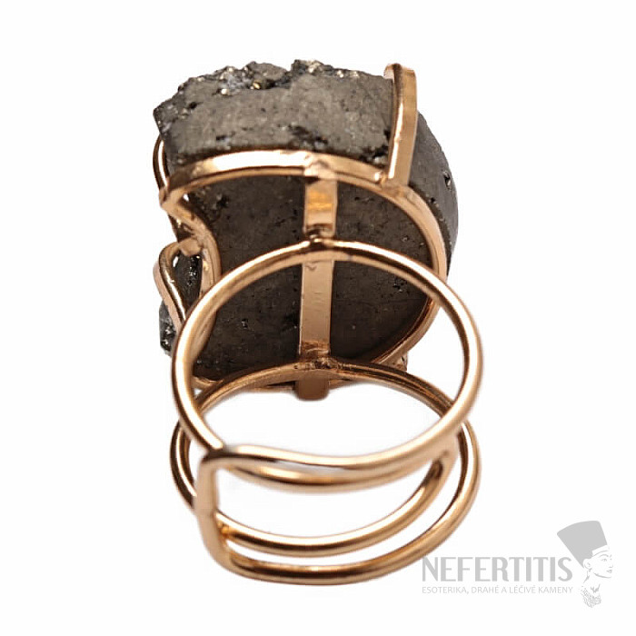 Objevte kouzlo elegance s tímto pozlaceným prstenem s třpytící se drúzou pyritu. Kovově zlatý lesk pyritu připomíná zlato, na rozdíl od něj ale působí divoce a nespoutaně. Každý kámen je originál. Pyrit je kamenem ochrany, vitality a hojnosti. Podporuje vnitřní sílu, zdravé sebevědomí a odhodlání. Je to kámen činů, stability a odvahy. Materiál: přírodní kámen, postříbřená mosaz. Kupujete přímo vyobrazený šperk.