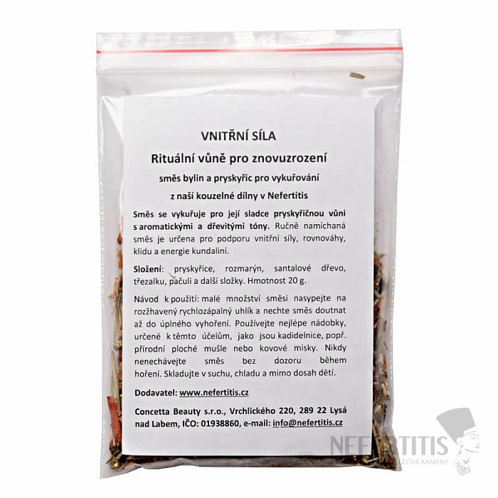 Směs obsahuje pryskyřice, rozmarýn, pačuli, santalové dřevo, třezalku a další složky. Hmotnost 20 g.